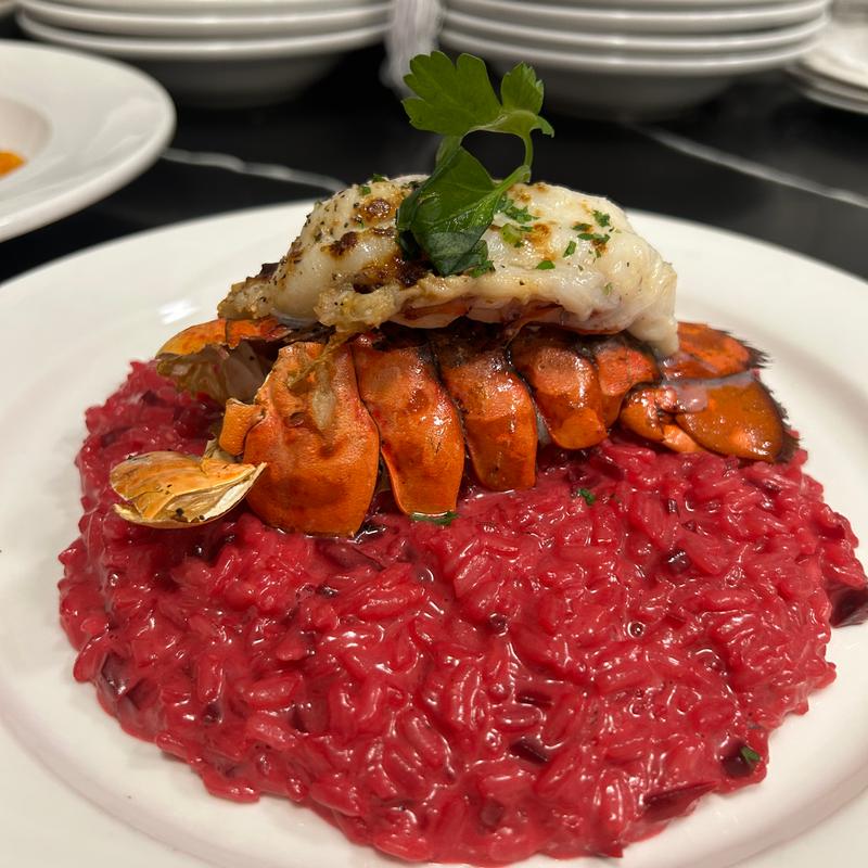 Aged carnoroli rice, butter, cream, deboned & cleaned, stuffed w/ rosemary parmesan cheese, w/ roasted beets & main lobster tail