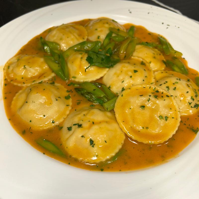 Home made stuffed w/ pulled crab meat in a lobster sauce & grilled asparagus