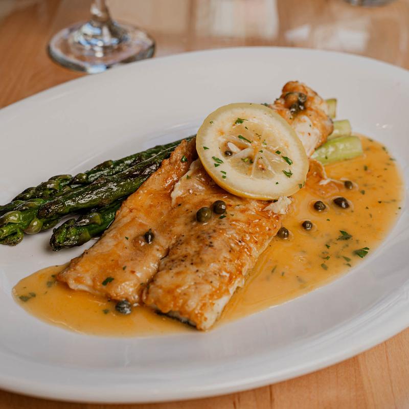 Mediterranean sea bass in a lemon capers, white wine & lobster bisque sauce w/ grilled asparagus