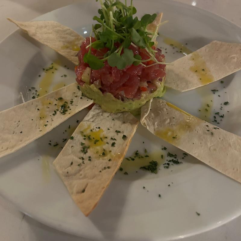 Ahi tuna tartar, capers, red onion, bell pepper, avocado, cucumber, E.V.O.O dressing w/ lavash