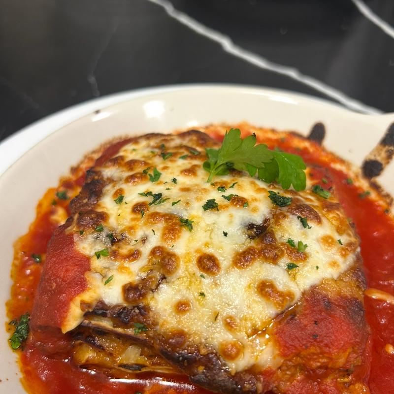 Layered in belchemel, beef & veal w touch of tomato sauce & topped w/ mozzarella & Parmesan cheese