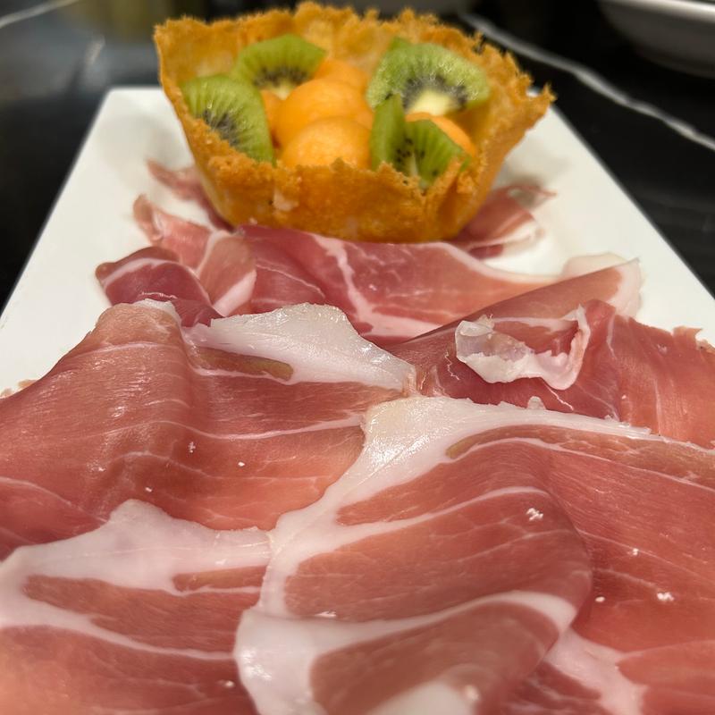 Fresh kiwi, ripe cantaloupe & prosciutto di parma in a parmesan basket