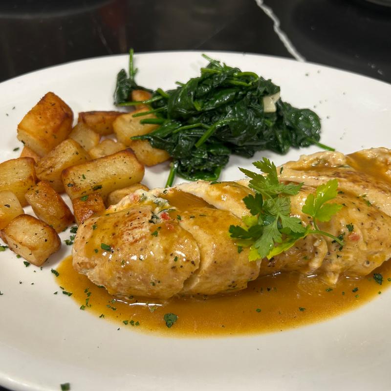 Stuffed w/ goat cheese, & sun dried tomatoes in a demi glass wine sauce w/ roasted potatoes & spinach